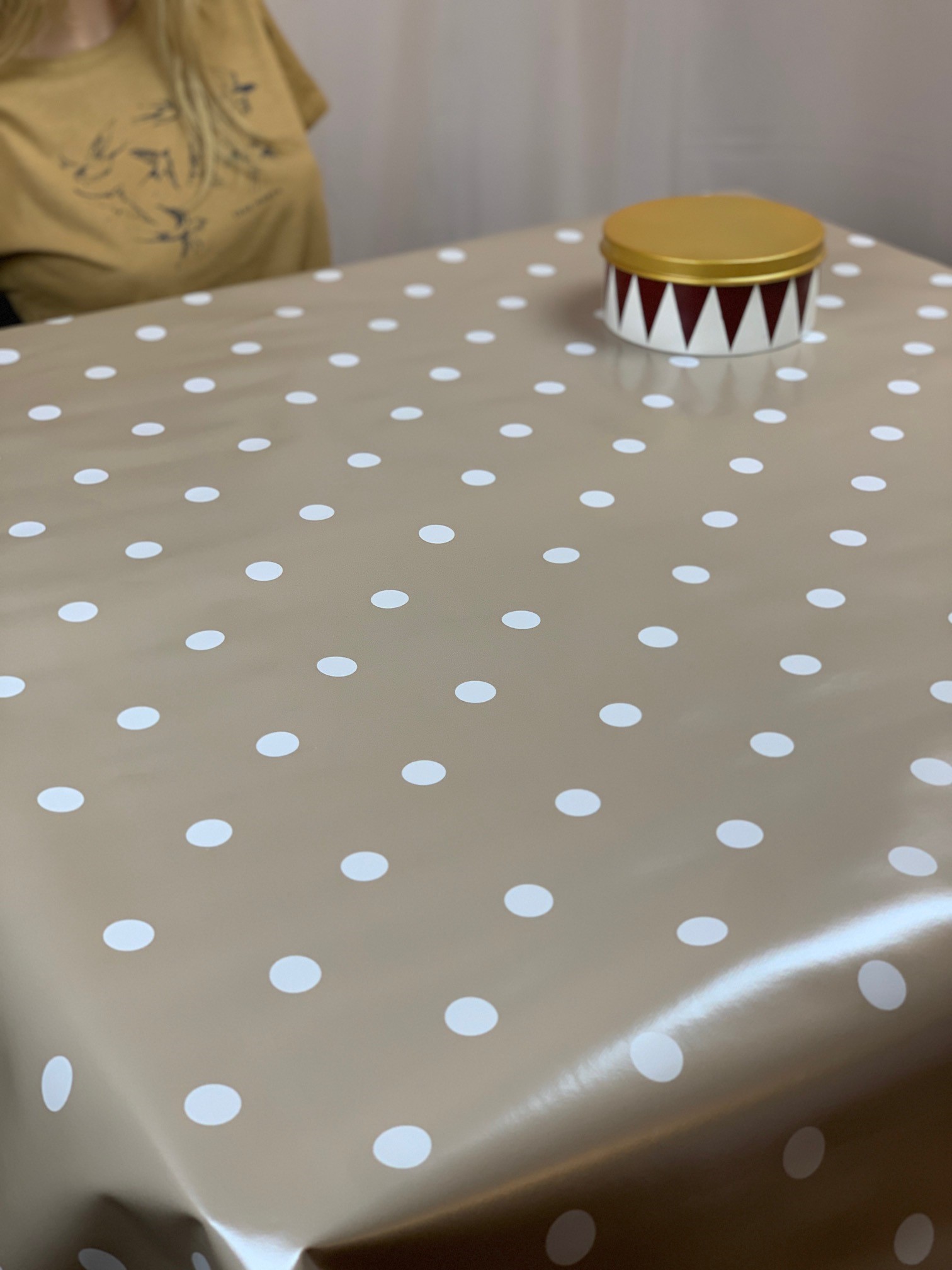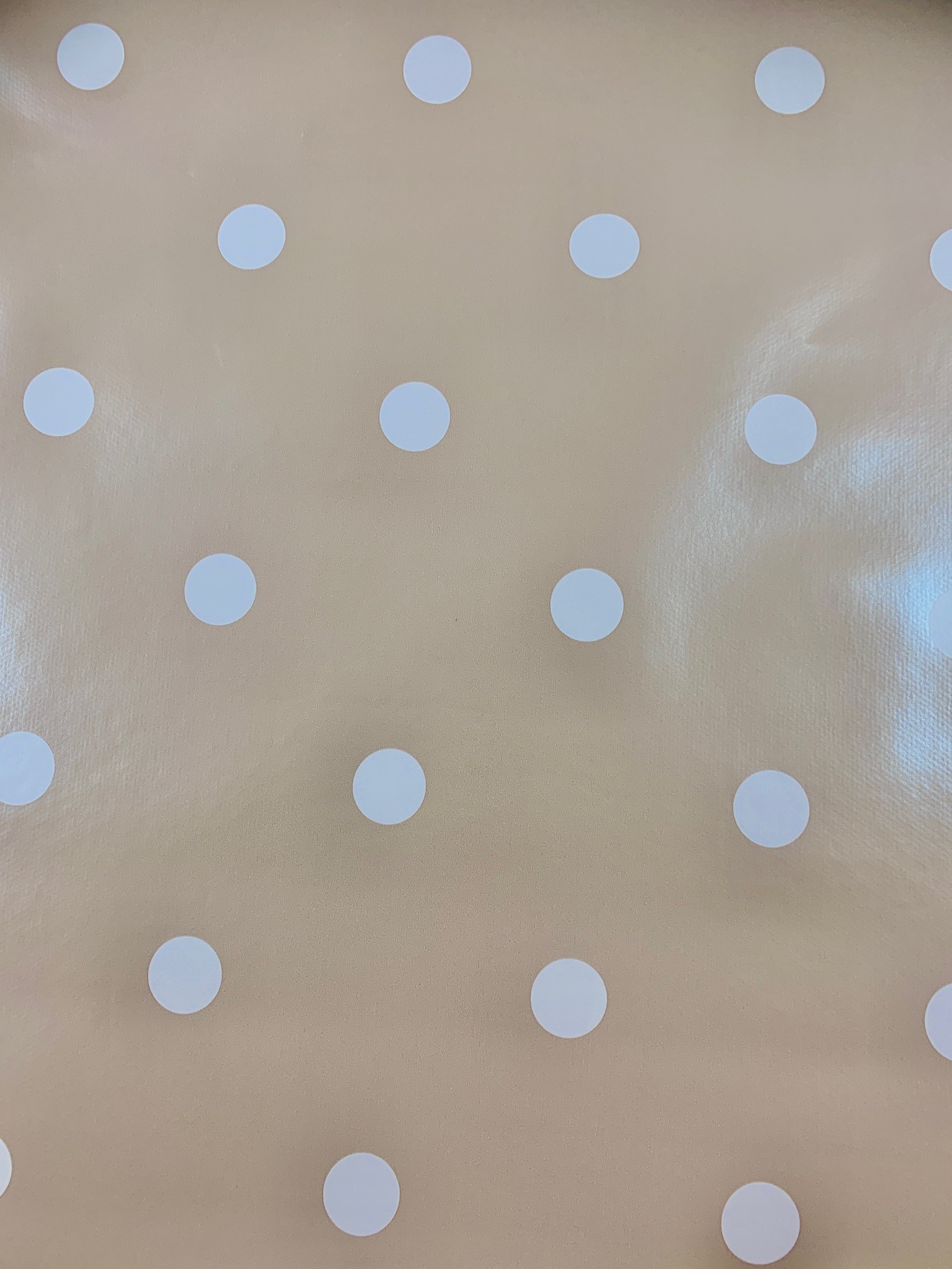 Vitprickig vaxduk med beige botten Vaxduken passar fint såväl inomhus som utomhus. Vaxduken är gjord av PVC enligt Öko-tex standard. Vaxduken är lätt och hålla ren och torkas av med en fuktig trasa.