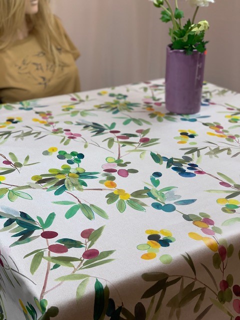 Vacker vaxduk med oliver i pastellmönster. Vaxduken passar fint såväl inomhus som utomhus. Vaxduken är gjord av PVC enligt Öko-tex standard. Vaxduken är lätt och hålla ren och torkas av med en fuktig trasa.