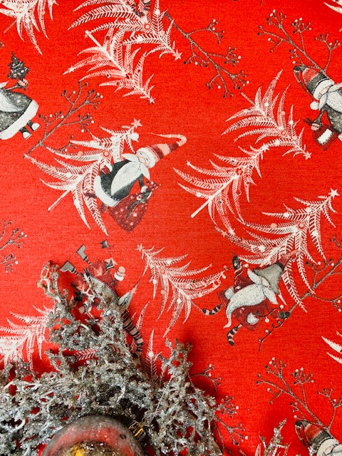 Rund Granar och tomtar på röd botten