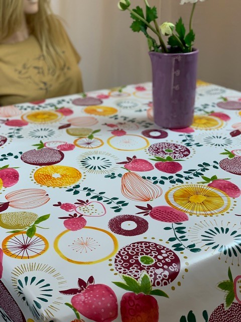Snygg rund vaxduk med lite flossad baksida så den ligger perfekt på bordet. Väldigt lätthanterlig och enkelt att hålla ren. Går att beställa i vilket mått du vill. 140 cm är bredden.