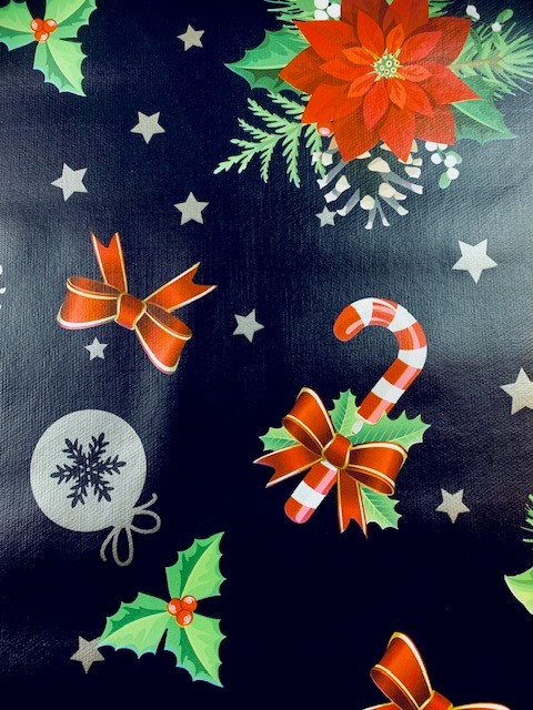 Rund Vaxduk med julblomma på blå botten i vintrig jullandskap! Går att få som rund i diameter 138cm