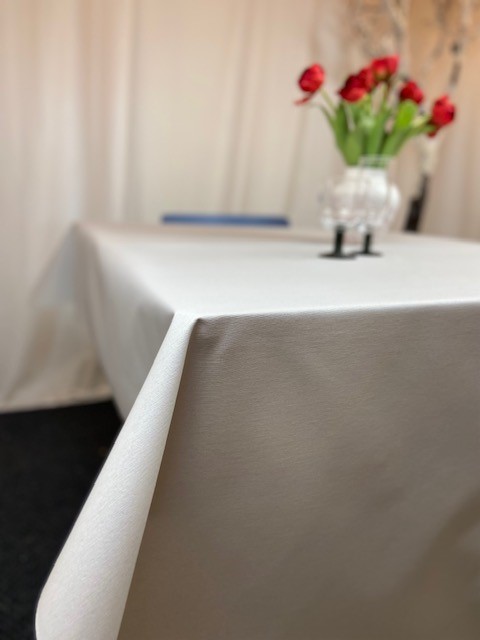 Avtorkningsbar rund ljusgrå acrylatbehandlad textilvaxduk, tillverkad i bomull/polyester.
