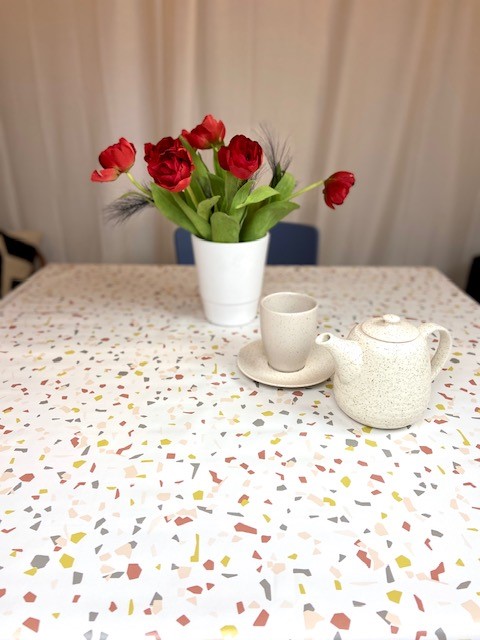 Rund Mosaikvaxduk på vit botten. Vaxduken passar fint såväl inomhus som utomhus. Vaxduken är gjord av PVC enligt Öko-tex standard. Vaxduken är lätt och hålla ren och torkas av med en fuktig trasa.
