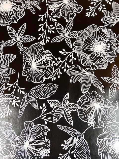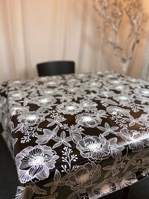 Häftig rund vaxduk med vita blommor på svart botten. Vaxduken passar fint såväl inomhus som utomhus. Vaxduken är gjord av PVC enligt Öko-tex standard. Vaxduken är lätt och hålla ren och torkas av med en fuktig trasa.