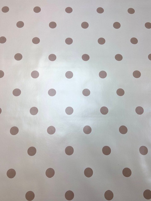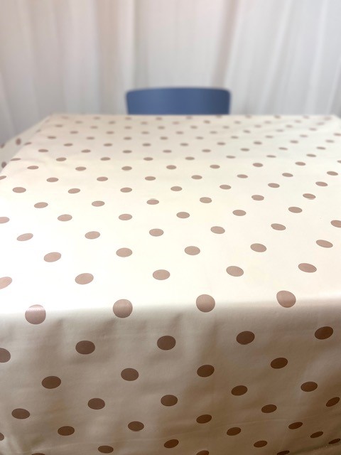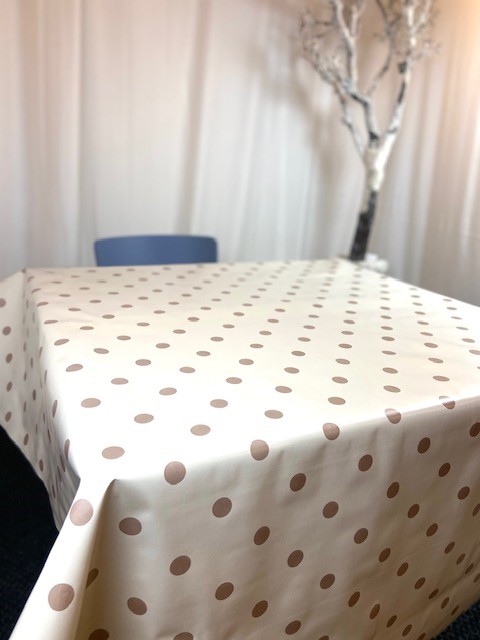 Vitprickig rund vaxduk med bruna prickar på vit botten. Vaxduken passar fint såväl inomhus som utomhus. Vaxduken är gjord av PVC enligt Öko-tex standard. Vaxduken är lätt och hålla ren och torkas av med en fuktig trasa.