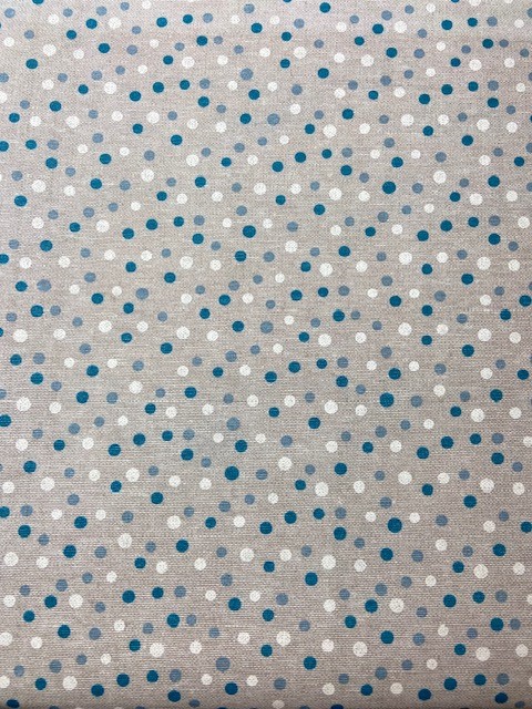 Neutral rund beige avtorkningsbar vaxduk med blå och vita prickar på beige botten. Väldigt snygg som passar in i väldigt många miljöer!