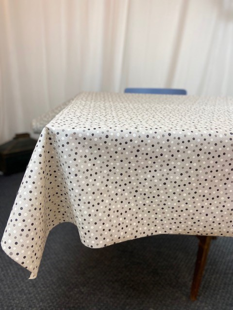 Rund neutral beige avtorkningsbar vaxduk med svarta och vita prickar på beige botten. Väldigt snygg som passar in i väldigt många miljöer!