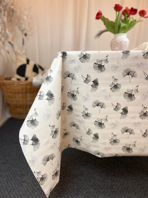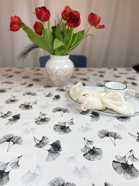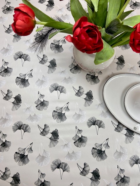Underbar rund vaxduk med ginkoblommor. Vaxduken passar fint såväl inomhus som utomhus. Vaxduken är gjord av PVC enligt Öko-tex standard tillverkad i EU. Vaxduken är lätt och hålla ren och torkas av med en fuktig trasa.