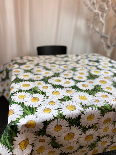 Underbar rund vaxduk med prästkrage. Vaxduken passar fint såväl inomhus som utomhus. Vaxduken är gjord av PVC enligt Öko-tex standard. Vaxduken är lätt och hålla ren och torkas av med en fuktig trasa.